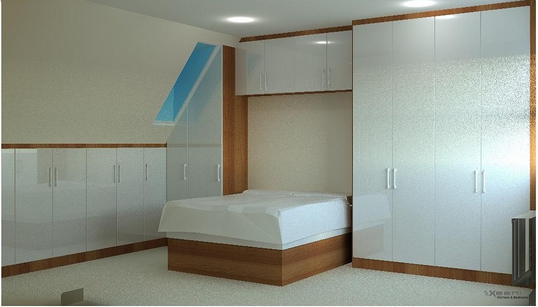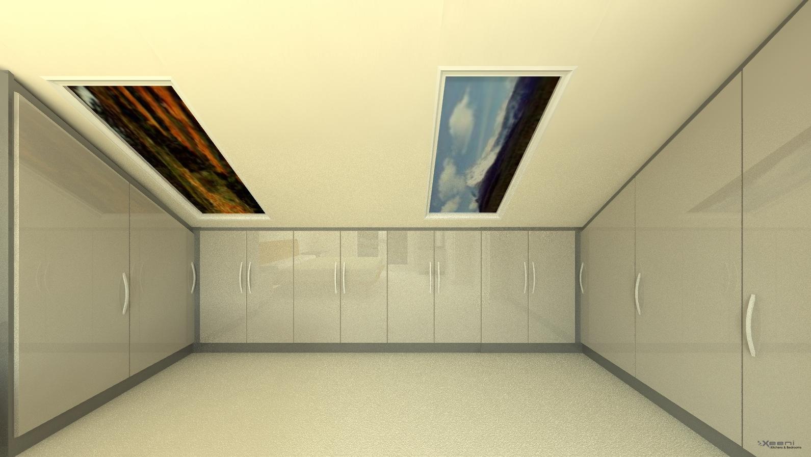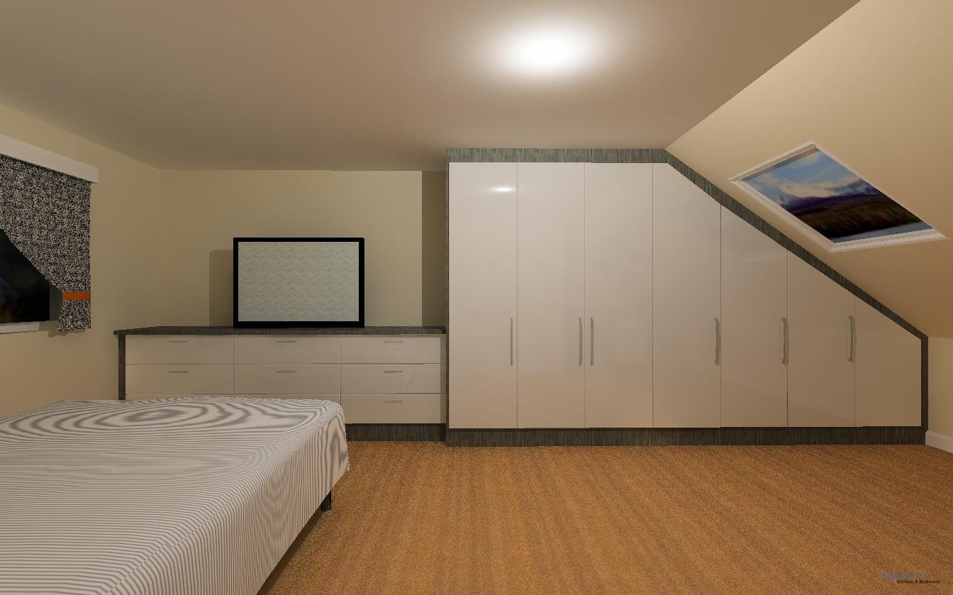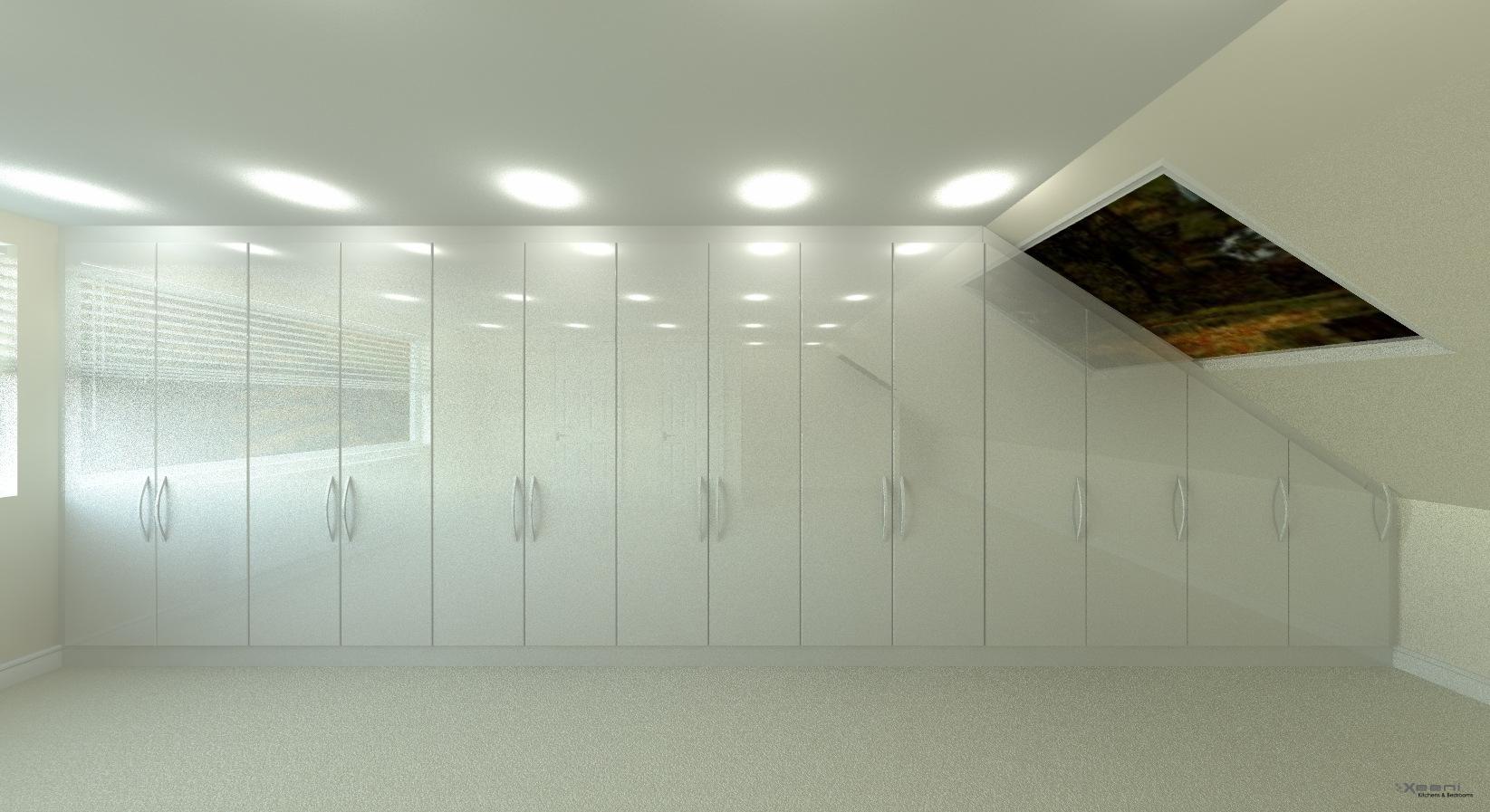 A sleek fitted wardrobe seamlessly integrated into a sloped attic space, with soft lighting and clever storage.